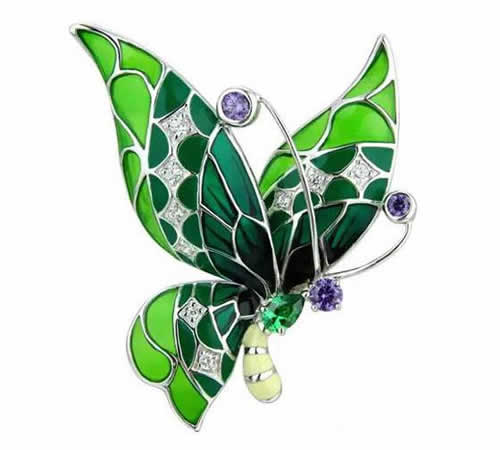 女士佩戴翡翠胸针的方位可以随心所欲,传统的扣法是将胸针扣在外套的翻领上。